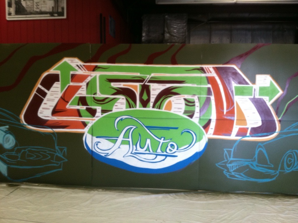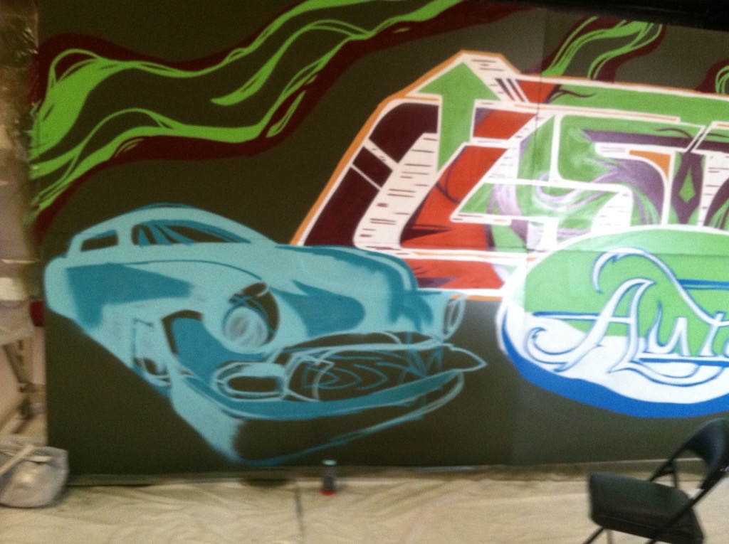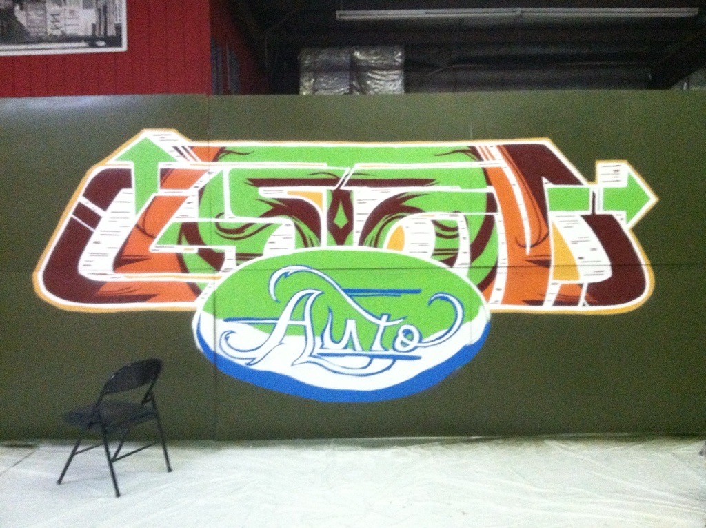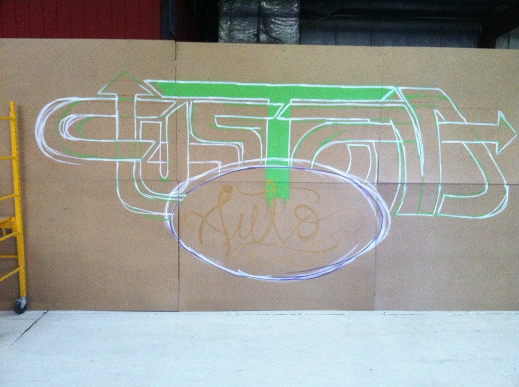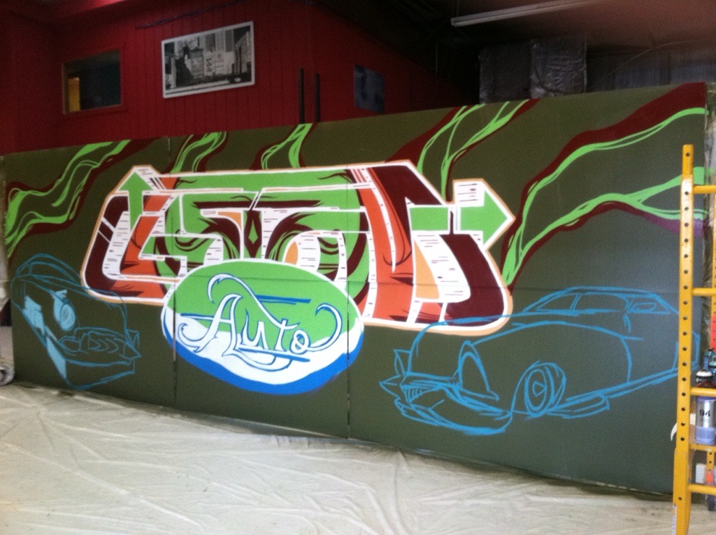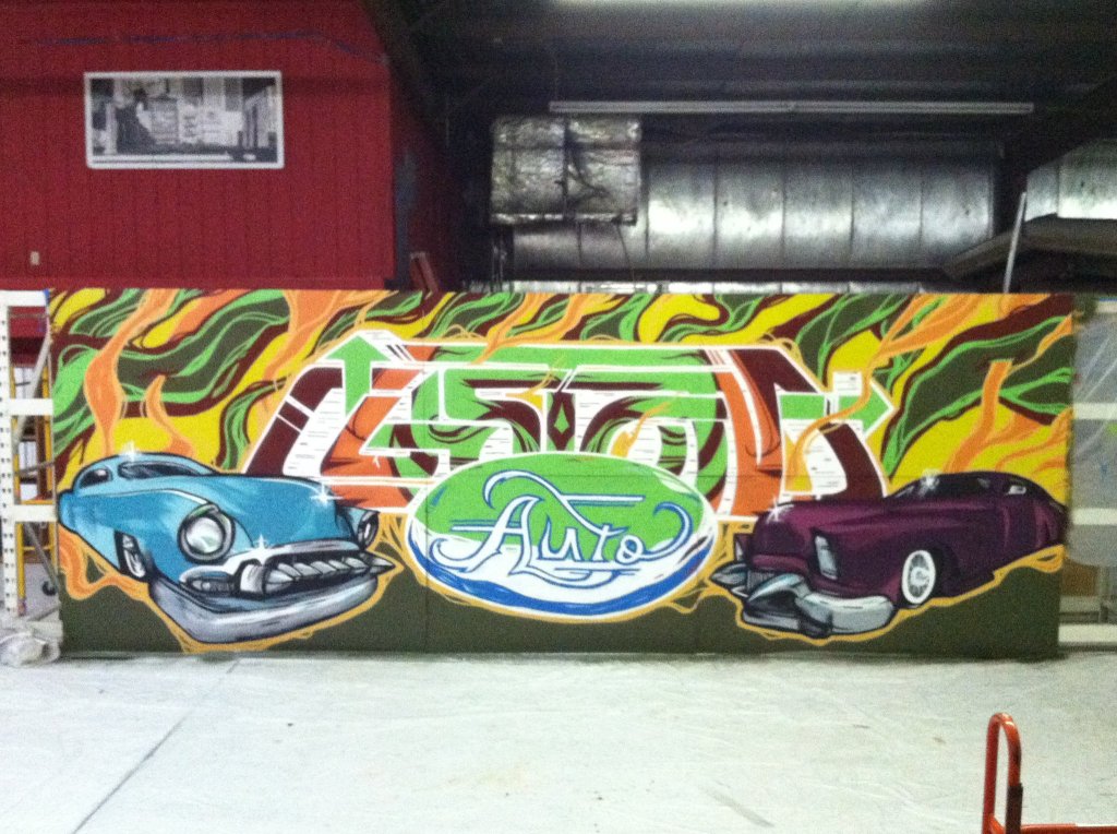 Custom Auto, a Las Vegas-based auto shop, commissioned me to create a portable mural that could move with them if they ever relocated. The piece spanned six 4’x8’ panels of primed MDF, allowing for flexibility while maintaining a large, cohesive design. I designed a custom hand-lettered logo and brought it to life with spray paint, incorporating vintage cars in a bold, cartoonish Dick Tracy-style aesthetic.