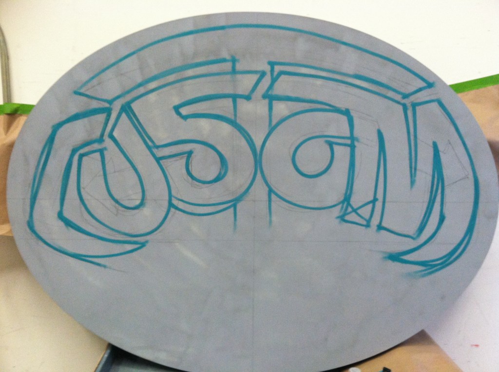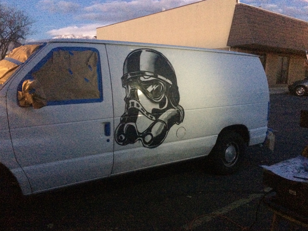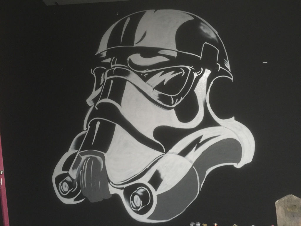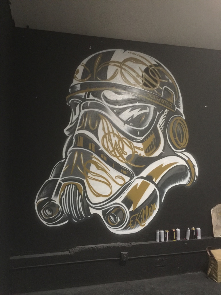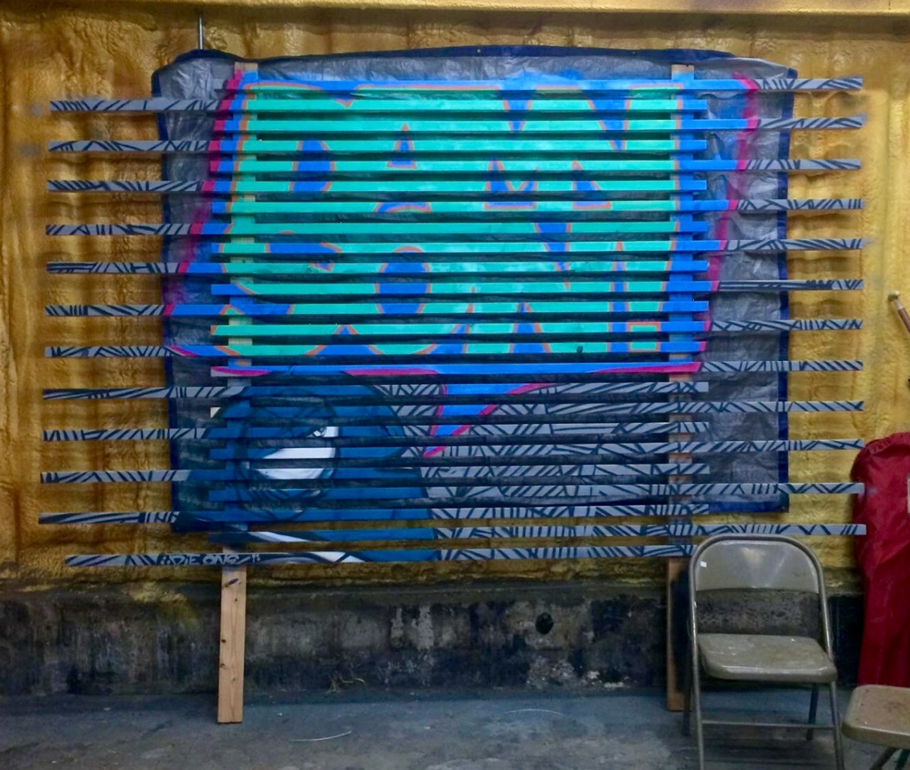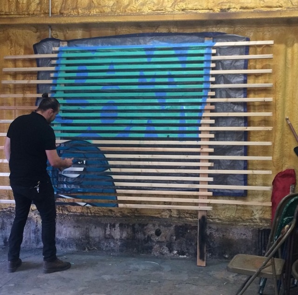 I was commissioned by DAMNSON!, a Utah-based music production and clothing company, to create a portable feature wall for use in trade shows and pop-up shops. The backdrop was constructed from horizontal wood slats with alternating spacing, creating subtle negative space that added depth to the design. Using spray paint, I applied a bold mural with my business fish and the DAMNSON! logo, blending artistry with brand identity in a way that felt both raw and refined. The final piece not only served as a striking visual anchor for their events but also reinforced their brand’s edgy, creative energy.