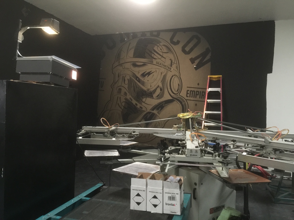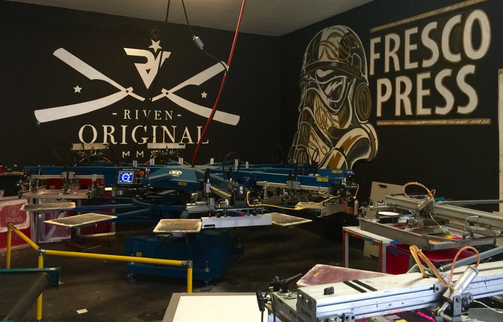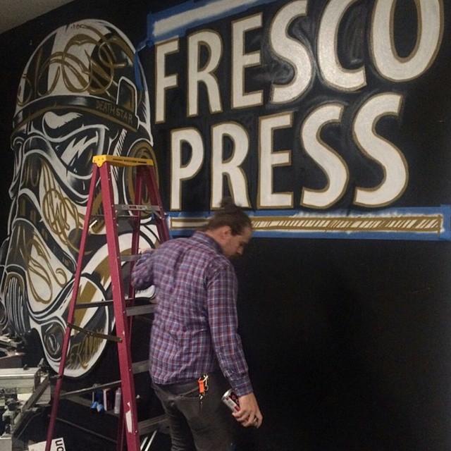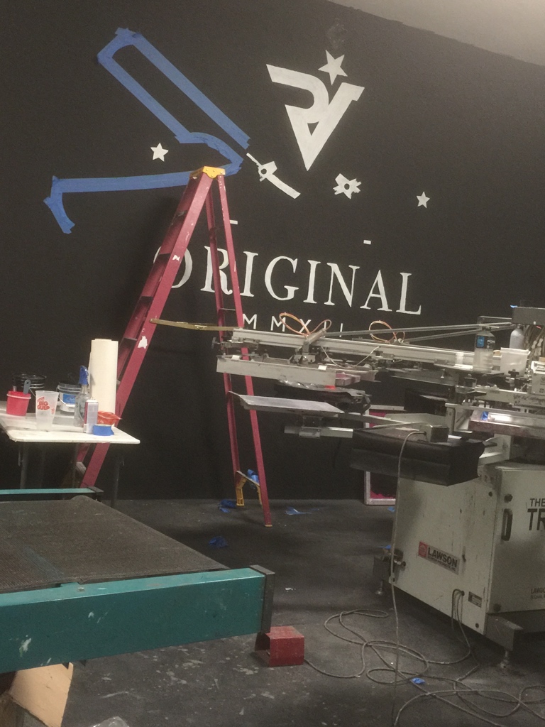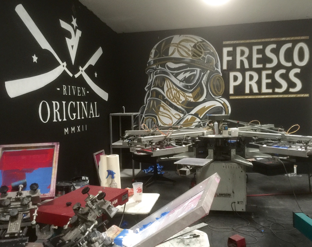 I had the opportunity to create two murals for the collaborative space of Fresco Press and Riven, a marketing and screen-printing coalition. Each mural reflected the unique identity of its respective brand while contributing to the shop’s creative energy. The Fresco Press mural, designed by one of their regular local artists, was brought to life using spray paint, staying true to their bold and dynamic aesthetic. In contrast, the Riven mural, designed by a different artist, was executed with traditional hand-lettering techniques using brush paint, reinforcing their dedication to craftsmanship and timeless design. This project was a great blend of technical execution and artistic interpretation, enhancing the workspace with visually striking, brand-aligned artwork.