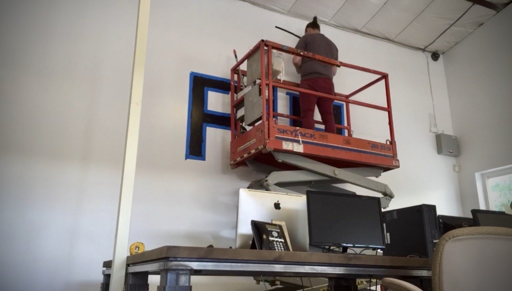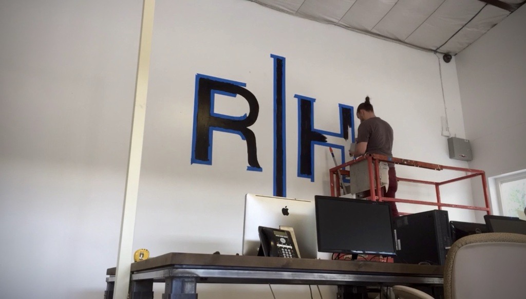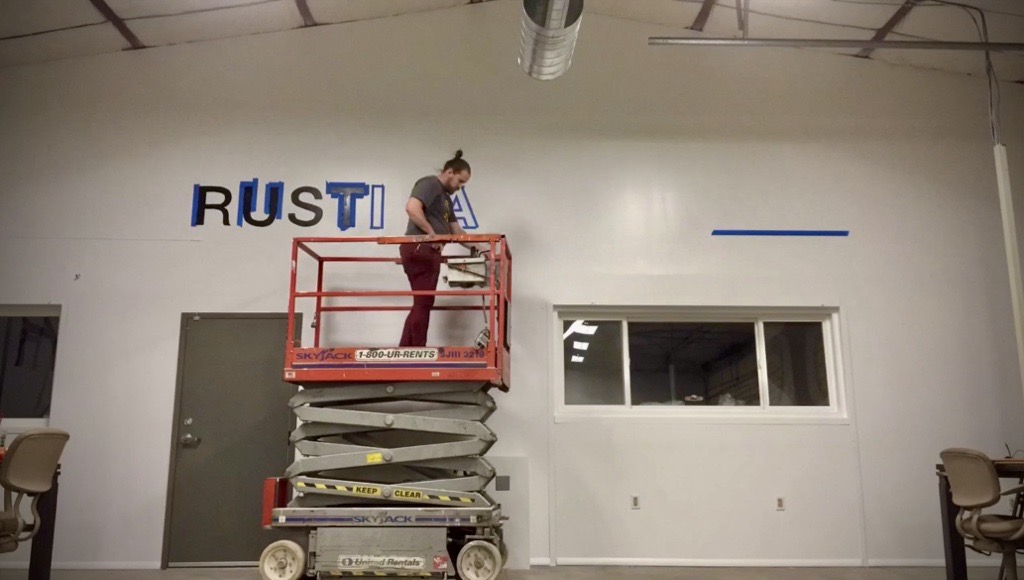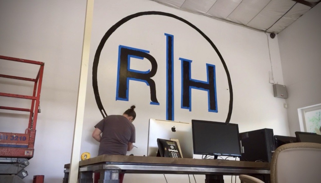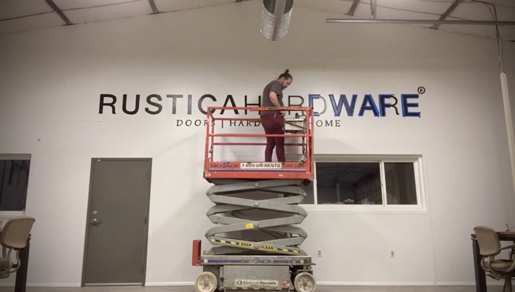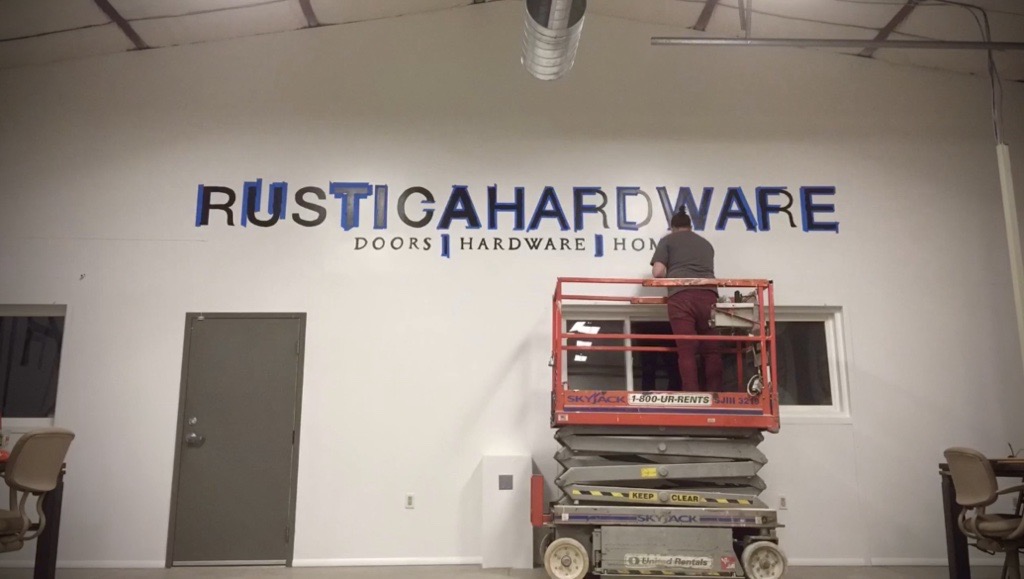 While working at Rustica Hardware, I was tasked with hand-painting a large-scale mural for their new sales offices. Using a scissor lift, I executed their logo and key slogans in a bold yet minimal black-on-white style, reinforcing the brand’s identity with a clean, impactful aesthetic. This mural not only enhanced the workspace but also served as a strong visual representation of Rustica Hardware’s craftsmanship and design ethos.
